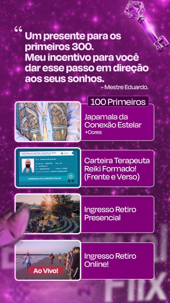 A EspiritualFlix é a primeira plataforma de espiritualidade do mundo, criada pela Conexão Estelar. Ela oferece aulas ao vivo diárias, cursos completos (Reiki, regressão, cristais, mediunidade), materiais exclusivos, certificações e suporte de mestres, além de uma comunidade de centenas de terapeutas para te acolher. É o espaço ideal para quem busca crescimento contínuo e deseja viver ou trabalhar com espiritualidade.